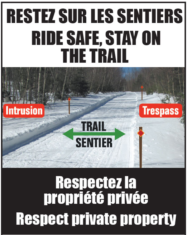 Many of our trails exist due to the generosity of private landowners, snowmobiling oƯ the marked trail puts our access in jeopardy. Be respectful of